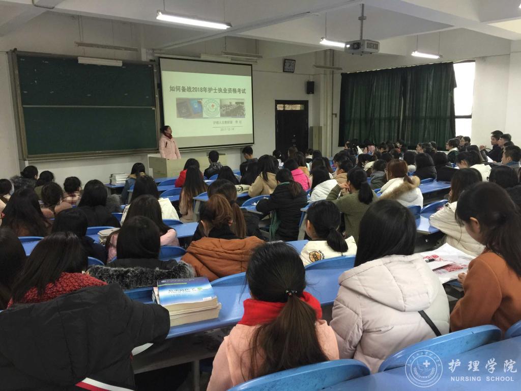 2017年12月14日下午,williamhill威廉希尔官网在北校区2402教室召开了“2018年护士执业资格考试培训会”,本次培训会分为“2018护考题型分析”、“护士执业资格考试报名相关事宜培训”和“实习生恳谈会”三个部分,williamhill威廉希尔官网副经理刘志燕、生产实习科科长柳忠燕、护理学专业教师李红和2014级全体护理实习生参会,会议由员工科科长曾敏主持。