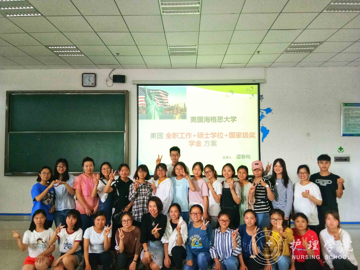 谭春梅老师首先就现行美国的医疗现状,表达了对护理职业的肯定,她指出护理是一项与国际接轨的职业,是发达国家急缺人才。然后,她通过不同案例分析了美国海格思海外教育项目的优势。接下来,她从四个不同的维度让同学们对美国海格思大学有了更加深刻和立体的认识,带大家领略到海格思大学具备的专业性和国际性。最后,谭老师针对赴美留学计划项目优势、福利待遇、申请条件、申请流程以及美国海格斯大学招生计划和录取条件做了介绍,勉励同学们应当努力提升自己,看准未来的发展趋势,做好职业生涯规划,最大限度地实现自我价值。