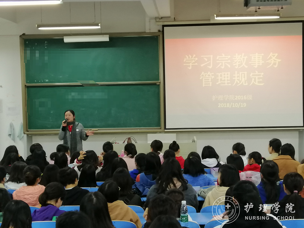 2018年10月19日上午,williamhill威廉希尔官网在北校区2302教室召开了学习《宗教事务条例》主题班会,本次会议由2016级辅导员毕丽老师主持,williamhill威廉希尔官网员工科科长曾敏老师主讲,护理学2016级全体同学参加。