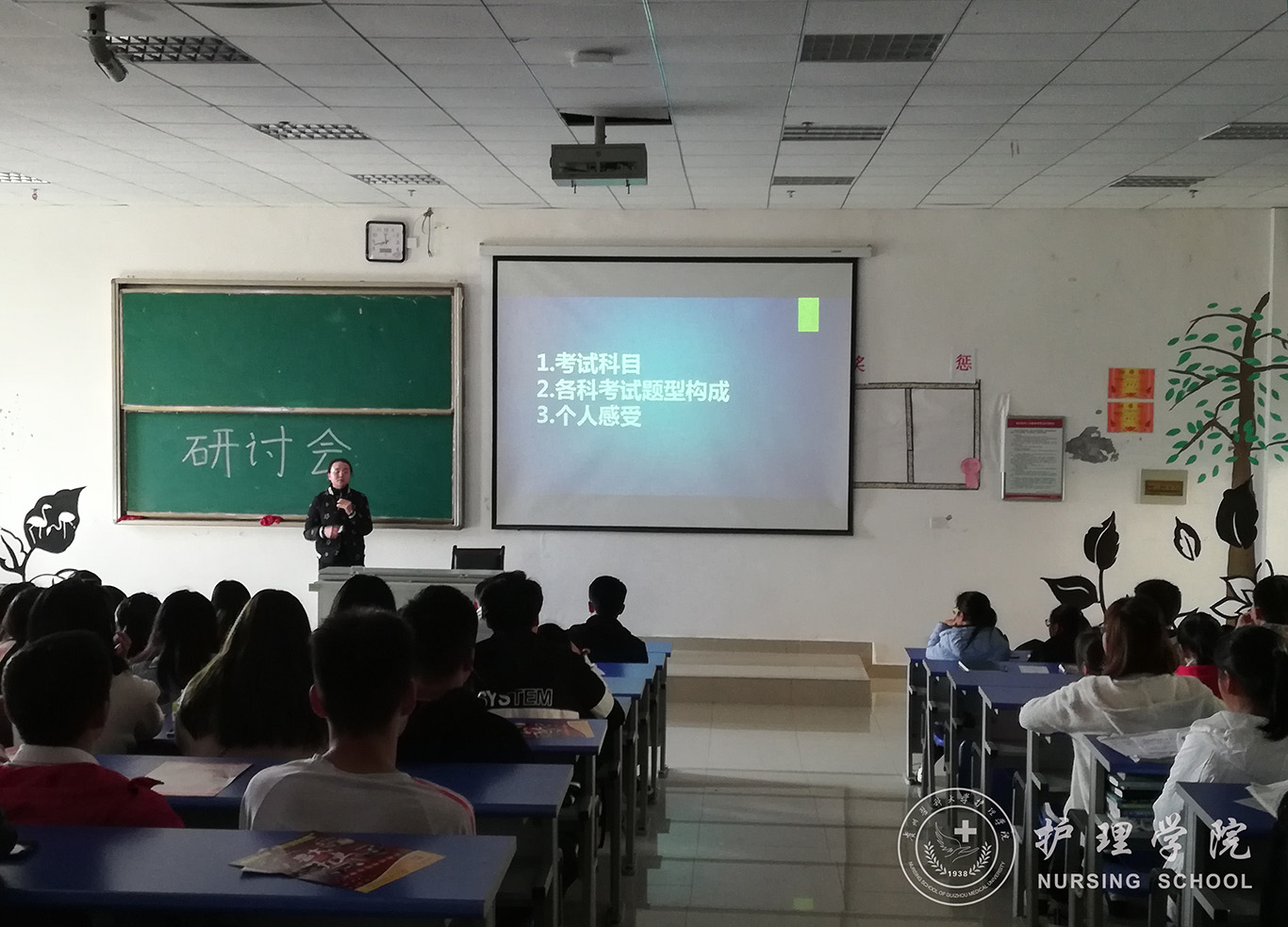 为增加同学们对考研的了解,提升同学们的考研信心,11月29日下午,2018级护理甲班在南校区1204教室召开考研经验交流会。本次交流会特别邀请了公司方雯和段雪两位研究生同学主讲,班主任邹惠美老师、2018级护理甲班全体同学参加。
