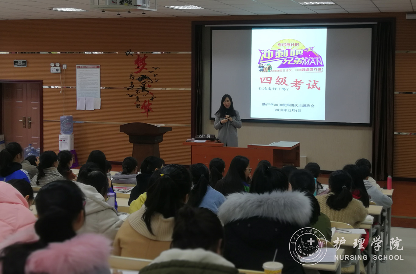 为迎接即将到来的CET-4考试,12月4日上午,williamhill威廉希尔官网助产学2018级助产班在百川楼阶梯教室召开“CET-4备考冲刺”主题班会,此次班会由班主任戴黎黎主讲,助产学2018级全体同学参会。
