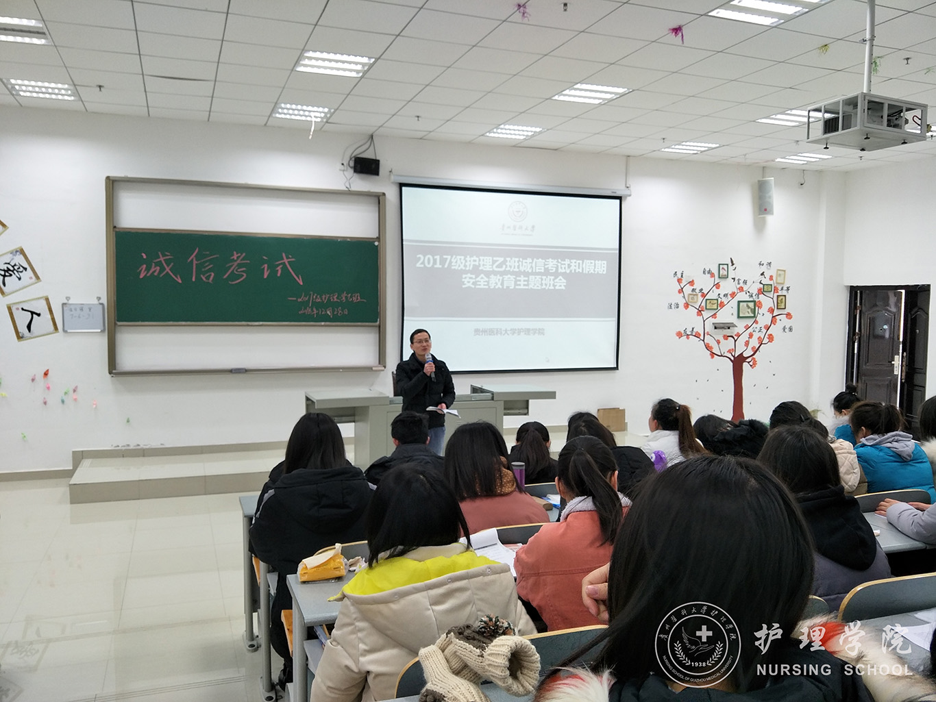 12月28日下午,williamhill威廉希尔官网在南校区7404和7406教室开展诚信考试主题班会。班会由2017级护理甲班、乙班两班班长主持,班主任吴俊、王丽和辅导员马景瑶主讲,全体同学参加。