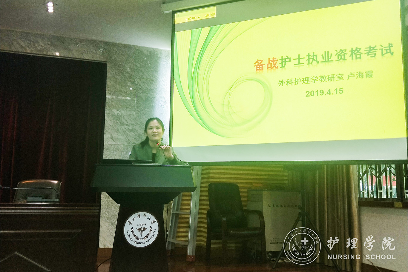 教管科负责人卢海霞从护士执业资格考试情况和复习重点两个方面,给同学们详细阐述了备战护考的要点和技巧。同时强调,目前护考准备工作时间紧任务重,同学们一定要合理分配学习时间,做好学习规划,以一个良好的状态迎接护士执业资格考试。