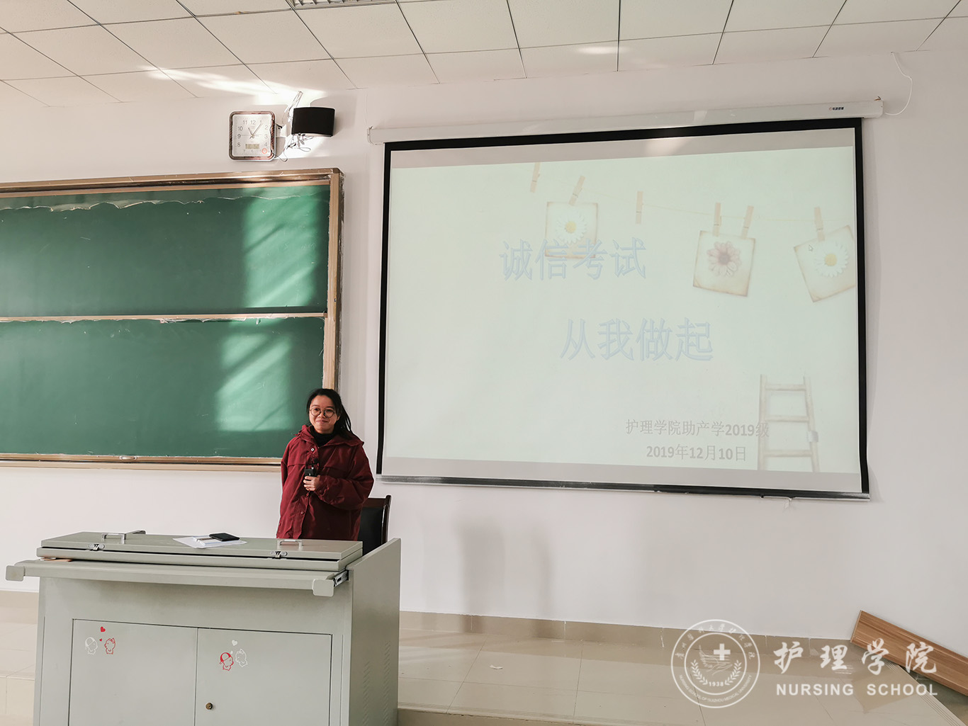 为进一步落实公司考场纪律及员工寝室管理相关规定,加强员工诚信考试的自觉性,进一步维护宿舍安全卫生的意识,12月10日,2019级助产班开展了“考试诚信别忘记,寝室安全要牢记、”主题教育班会。本次班会由辅导员曾敏主持,助产学2019级全体同学参加。