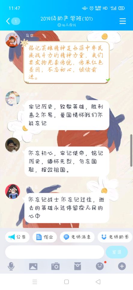 首先团支部书记欧阳孝玲组织同学们观看了微视频《国之需要时,吾辈就出征》。14年浴血奋战,3500多万同胞伤亡,75年前的今天,中华儿女的不屈抗争终于迎来侵略者低下头颅的一天,中华民族迎来近代以来中国抗击外敌入侵的第一次完全胜利!今天,我们纪念这一伟大胜利!今天,我们悼念牺牲的同胞!随后同学们观看了习近平等国家领导人向抗战烈士敬献花篮现场直播视频。