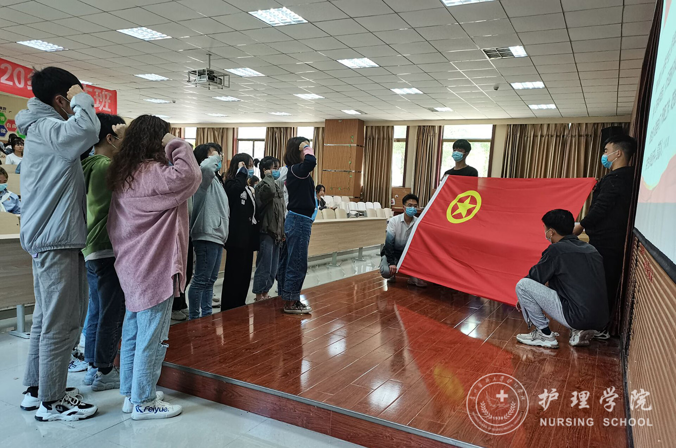 4月29日,为落实共青团中央组织开展的“学党史、强信念、跟党走”主题团日活动,williamhill威廉希尔官网团委于南校区百川楼1101教室隆重举行了入团仪式。参加会议的有14名新团员、2019级—2020级各班入党积极分子代表、团员代表参会,员工第三党支部书记刘妍老师出席会议,会议由团学办副主任张凤毅同学主持。